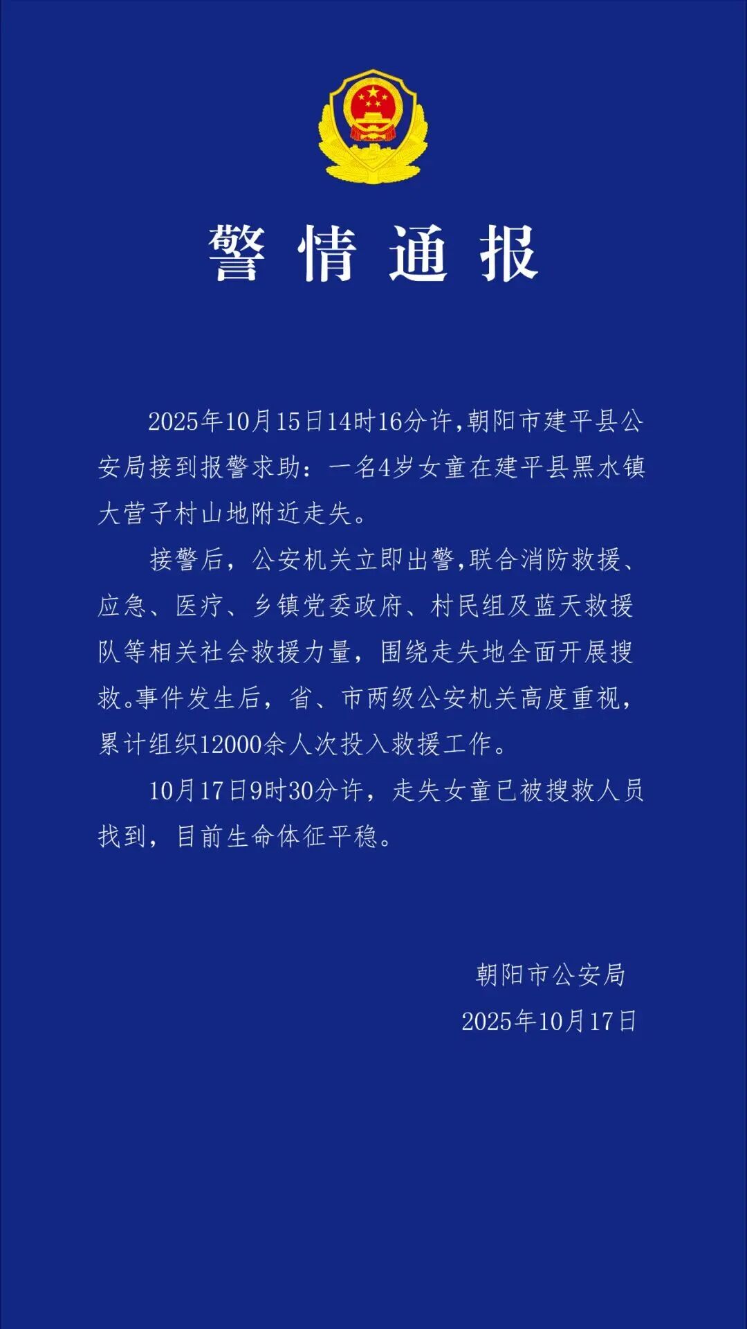 今天,辽宁朝阳市公安局发布警情通报:10月17日9时30分许,走失女童已被搜救人员找到,目前生命体征平稳。