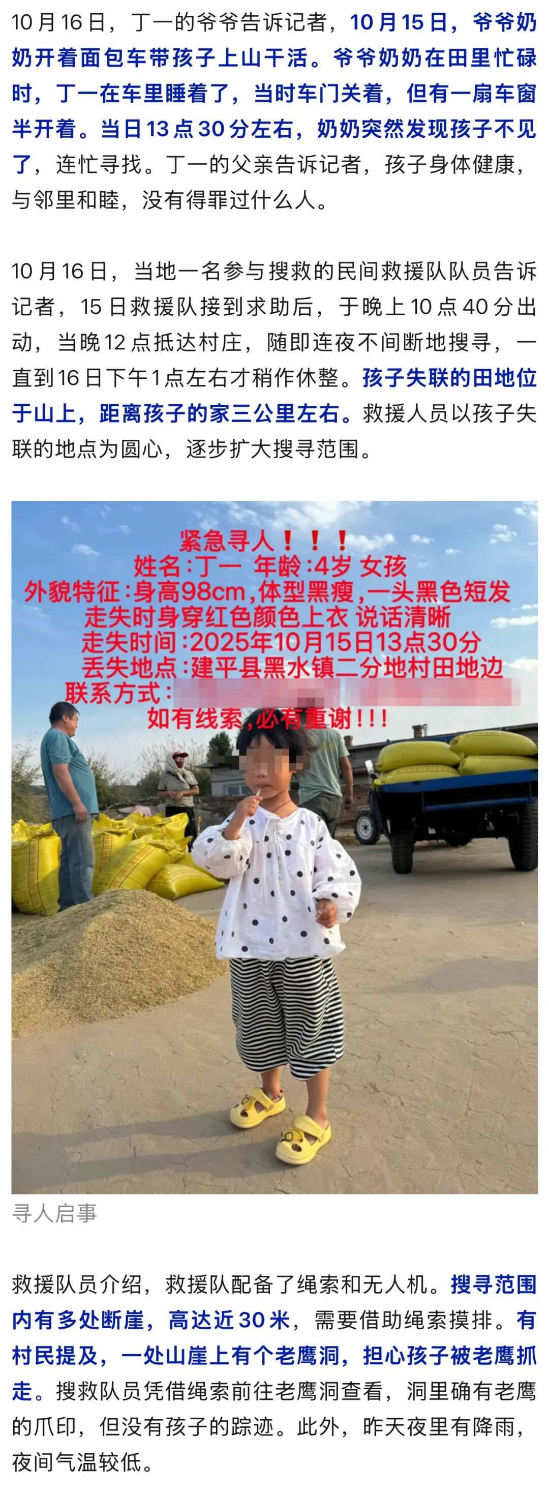 10月15日,辽宁朝阳市建平县黑水镇二分地村,一名4岁女孩丁一失联。据寻人启事,女孩身高98cm,体型偏瘦,一头黑色短发,走失时身穿红色上衣,说话清晰。